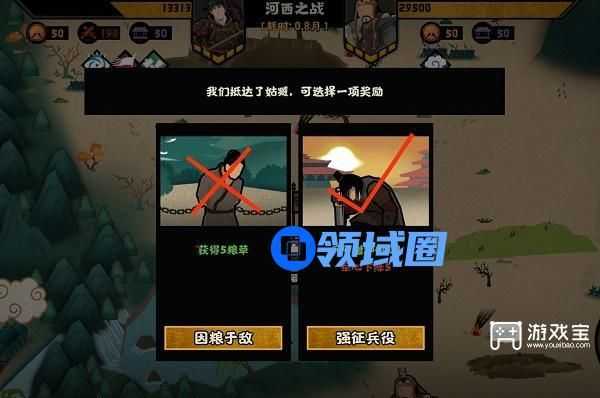 4.之后就可以正常打,打打三级据点拿卡牌,到营地用粮草买兵法,不过更推荐走灵洲路线到休屠泽,这样可以多两个营地,接下来,重点来了,到达休屠泽后就赶紧着手准备决战的兵力,营地的获胜奖励之后全部选择强征兵役