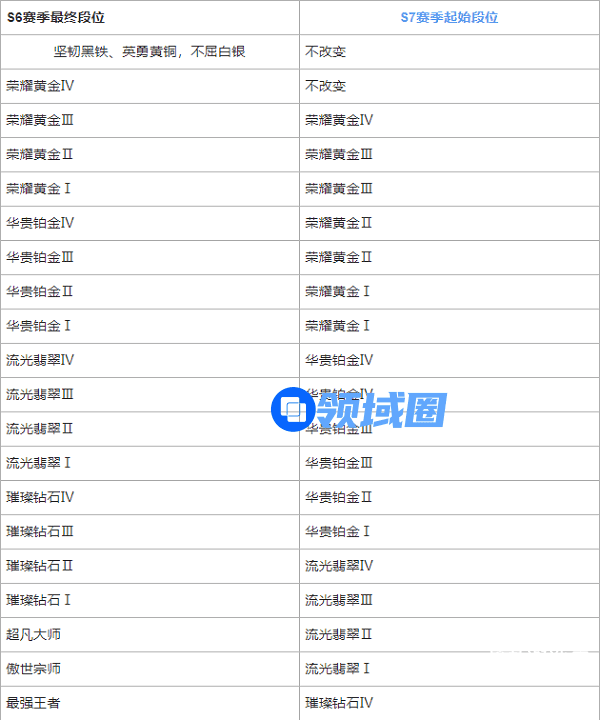 1.对于在S6赛季已完成定位赛的玩家来说,新赛季的起始段位将取决于S6赛季所达到的最终段位,详情如下: