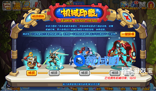 3、每日需要挑战界面的四只BOSS依次获得机械印章,前面三只可概率获得,挑战纳舜诺德必定掉落!当收集到前一只宠物的机械印章后方可挑战下一只。一天最多能拿到4枚机械印章,累计收集20枚即可把纳舜诺德带回家。