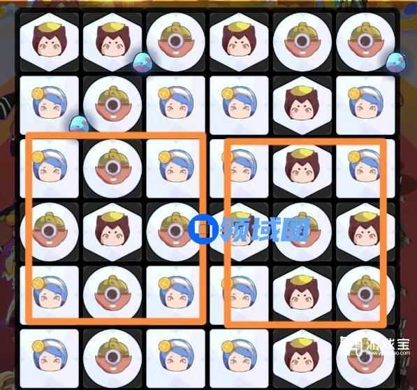 1、首先找出沙盘内数量≥5的两个图案,按照图一橙色框的位置把他们摆成棱形,中心点互质,最后换回来引爆消除。