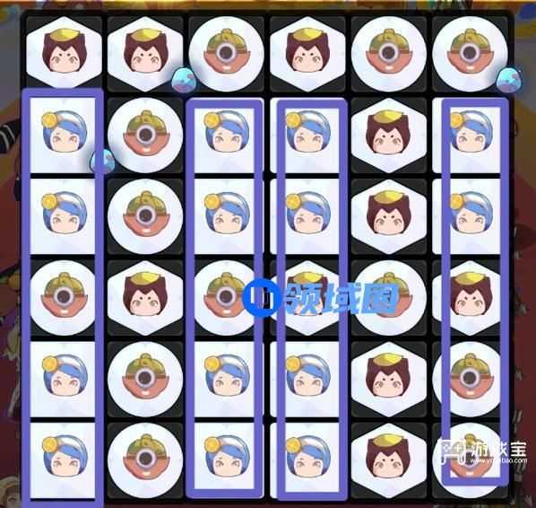 3、如图三紫色框显示,为了在引爆棱形后后续消除,所以上下放置1+2或者2+2的图案