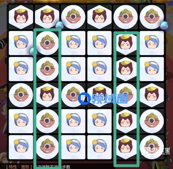 2、为了扩大引爆范围,如图二绿色框显示,中心图放置棱形框相同图案,如果没有多余图案,则把盘里数量不足消除的图案放在上下两端