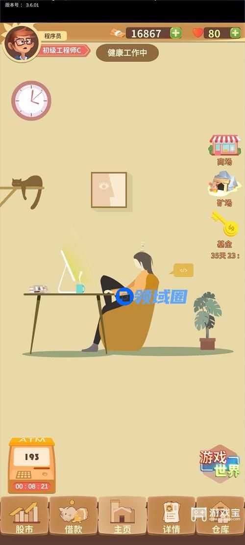 现实世界中,拿到钞票的方式是你的工资,以及各种各样的券和箱子,想要快速拿到钞票怎么办呢?你可以点击左上角人物的职级,如,上图中的初级工程师C,加班还可以加速升职的进度,但是有一点,大学生的工资是随着职级上升而下降的,请谨慎,加班需要消耗健康,其中如果你的健康值在80级以上,那么你的工作效率为100%,健康低于80时工作效率会下降,到健康20时,工作效率为0,你永远没工资可拿,因此在任何时候,除非马上要嗑药,请保证你的健康值在80。点击游戏右上方的健康值加号可以进入药店,在你健康低于80时,界面右侧会出现救护车也能让你进入药店。
