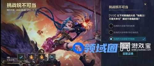 英雄联盟手游挑战锐不可当第三天答案是什么?第三天依旧是三道题目答对即可获得奖励,游戏宝小编带来英雄联盟手游挑战锐不可当第三天答案攻略,一起来看看吧。