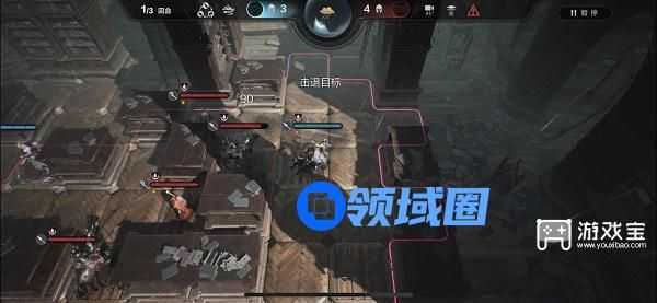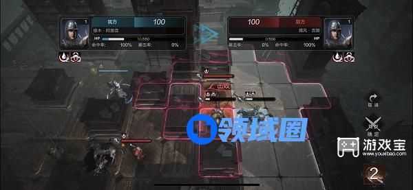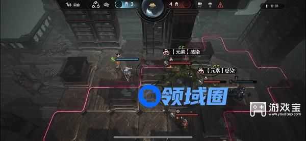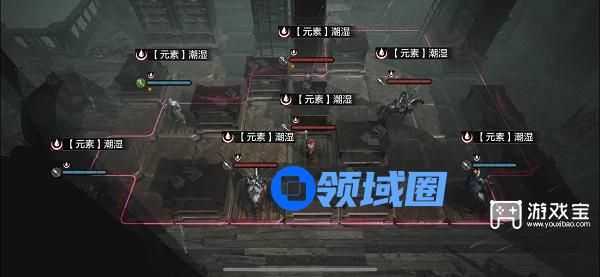 2、选择毒法,在下图所示的位置上使用技能,目标是敌方治疗师。由于场景有潮湿效果,因此毒法的毒元素跟潮湿(水元素)效果叠加,会使敌人获得感染debuff,感染能使得敌人无法获得增益和治疗效果。毒法技能范围大,下图中的枪骑和治疗师都能被施加感染debuff。