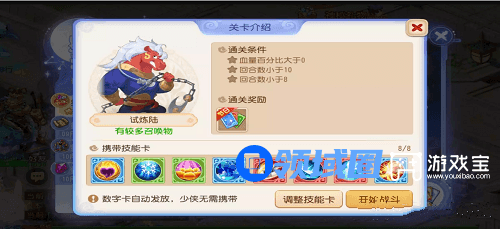 1、这一关可在自身拥有的卡牌里任选8张技能卡牌(加血必备),选择的卡牌将在本次战斗中随机出现,数字卡牌随机出现不占用卡牌槽。