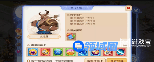 1、这一关可在自身拥有的卡牌里任选8张技能卡牌(加血必备)选择的卡牌将在本次战斗中随机出现,数字卡牌随机出现不占用卡牌槽。