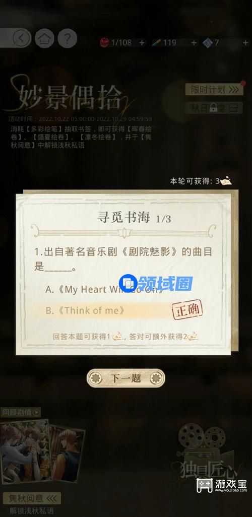光与夜之恋妙景偶拾活动里玩家需要出现的题目选择出正确的答案,游戏宝小编带来光与夜之恋妙景偶拾答案大全分享,一起来看看吧。