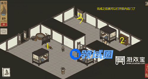 按照上图的顺序完成以后就可以打开内院的后门进去拿宝箱了。