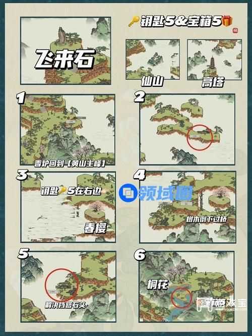 3、高塔:直接点击即可,点击香炉回到【黄山主峰】,按如图所示即可到达春樱和钥匙5,紧接着解决挡路的乱石,可到达桐花和宝箱5,最后点击香炉回到飞来石。