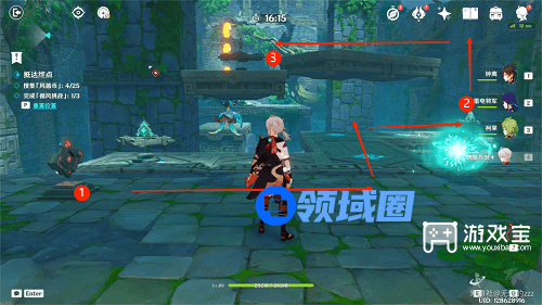 3、随后我们来到第二处地点,我们需要先将1号位置的机关关闭,随后前往2号机关处,将风场的方向设置为朝上的方向,随后将3号位置的机关风场朝向也设置为朝上的方向