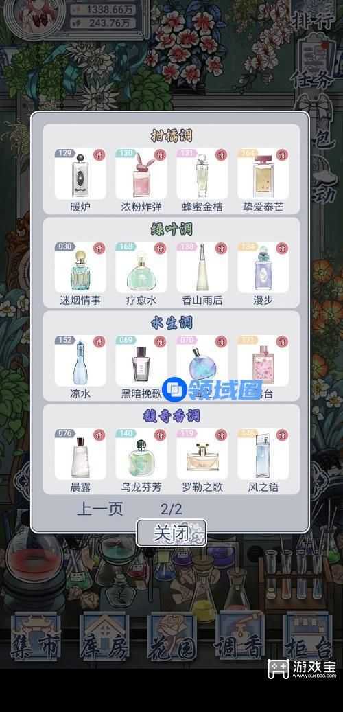 (1)香调:香水名称(种子数量,瓶子数量),红花瓣=种子价格*种子数量+瓶子定价*数量,黑花瓣=种子价格+种子数量。