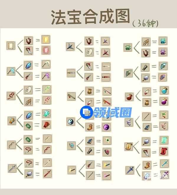 4.根据前人的合成表发现每个法宝和任意道具组合成魔和仙两种路线,每种道具至少可以进化2个法宝