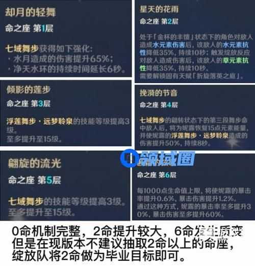 1、一命:附魔状态下的第三次A造成的伤害提升65%(增伤区),对于绽放流妮露来说意义不大;使E生成的水环可一直维持,(额外3次的弱水元素附着),意味着能生成更多的草原核,变相提高伤害。