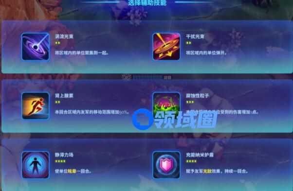 好了,你现在组建了完善的卡组进入了对战,但是别急,这时候你需要在三组技能中选择一组技能作为你这句对战的辅助技能,每位指挥官刷新出的都是6个技能,两两一组合计三组,这些技能是玩家能对战局进行直接影响的技能,涵盖了支援、输出、治疗、控制等方向。