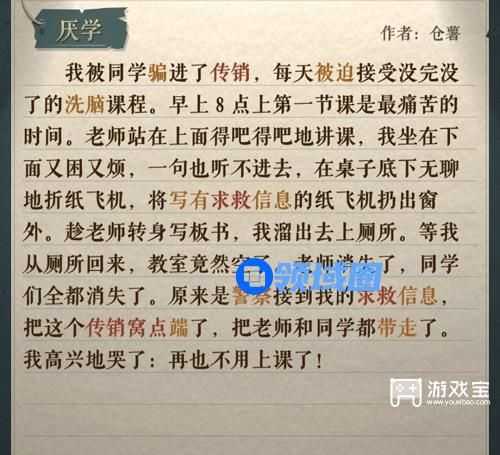 3、等我从厕所回来,教室竟然空了。老师消失了,同学们全都消失了。原来是警察接到我的求救信息,把这个传销窝点端了,把老师和同学都带走了。我高兴地哭了:再也不用上课了!