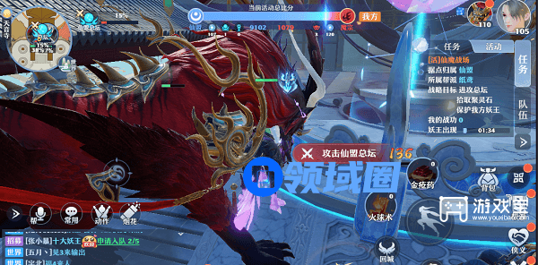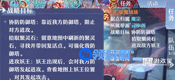 6.作为进攻方,要先摧毁敌方防御塔后占领敌方总坛。作为防守方,需阻止敌方玩家或者妖王进攻塔/总坛。玩法类似帮派演武的守塔,推塔,采集,击杀玩家。