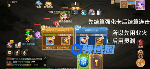 1、先结算强化卡后结算连击,所以先用业火后用灵渊。