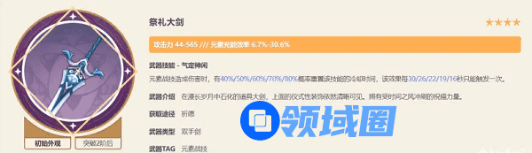 这把武器的充能面板非常不错,被动的回复效果在后台时也能生效,还是比较适合多莉的。但是需要武器原胚锻造而成,获取的难度较大。好在多莉也并不需要高精武器,只需要锻造一把就可以用,如果没抽到祭礼大剑的小伙伴可以考虑这把武器。