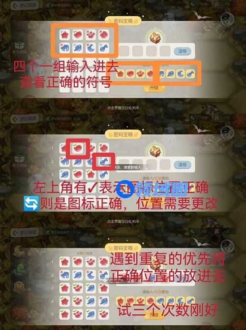3、遇到重复的,也是按照第一步输入两组,优先将正确位置的图案重复一遍,不对的话其余两个再试一次,次数也是够的。