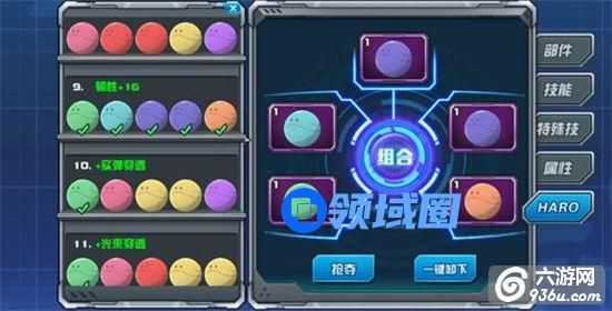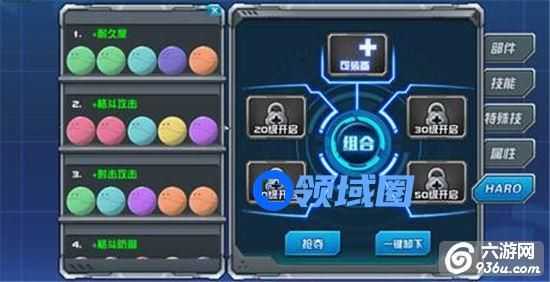 随着抢夺功能的开启第一个哈啰装备槽也随之开放,之后4个装备槽的开启等级分别是20级、30级、40级、50级。玩家可以点击机体-哈啰-相应的装备槽, 来选择需要装备的特定属性哈啰,而哈啰共有11种附加属性可以选择,分别是:提升耐久度、提升格斗攻击、提升射击攻击、提升格斗防御、提升射击防御、提升 命中、提升闪避、提升暴击、提升韧性、提升实弹穿透、提升光束穿透。