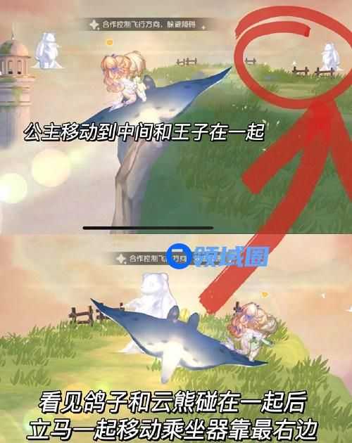 5、当看见左上角鸽子和云熊碰在一起后,立马一起移动乘坐器靠最右边。