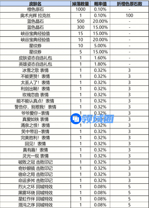 2.随机奖励概率:每次开启战利品宝箱,将随机获得一个奖励,奖励可重复获取。部分奖励重复获取后,将自动分解为橙色原石。
