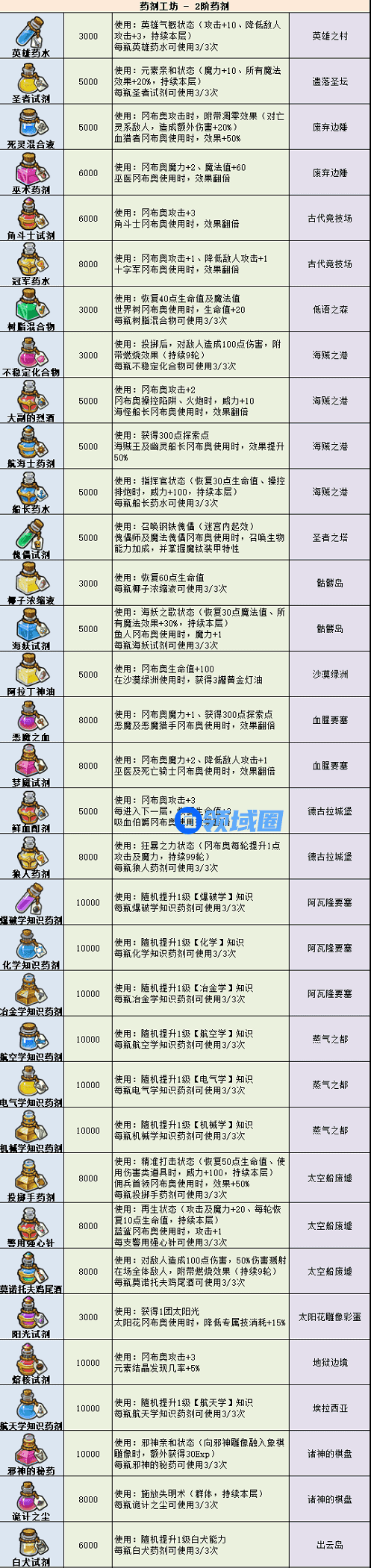 2、药剂师:不稳定化合物、冒险者试剂、强盗试剂、圣水、腐蚀之水、食尸鬼试剂、刺客试剂、航海士药剂、傀儡试剂、苏丹秘药