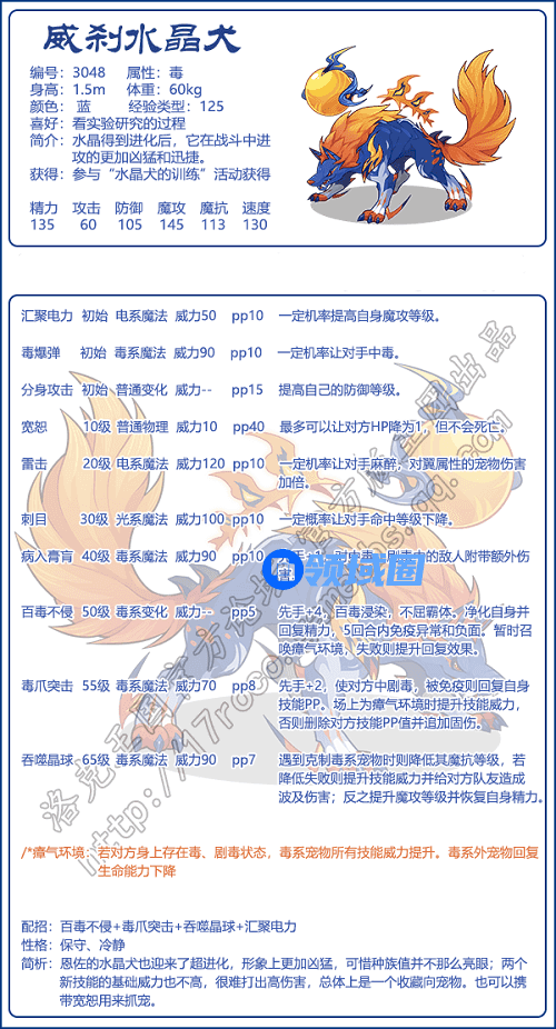 3、简析:恩佐的水晶犬也迎来了超进化,形象上更加凶勐,可惜种族值并不那么亮眼,两个新技能的基础威力也不高,很难打出高伤害,总体上是一个收藏向宠物。也可以携带宽恕用来抓宠。