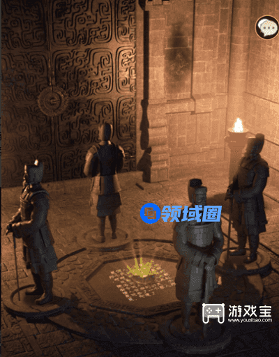 2、兵马俑如图站位,点击后面墙体有箭头示意站位。