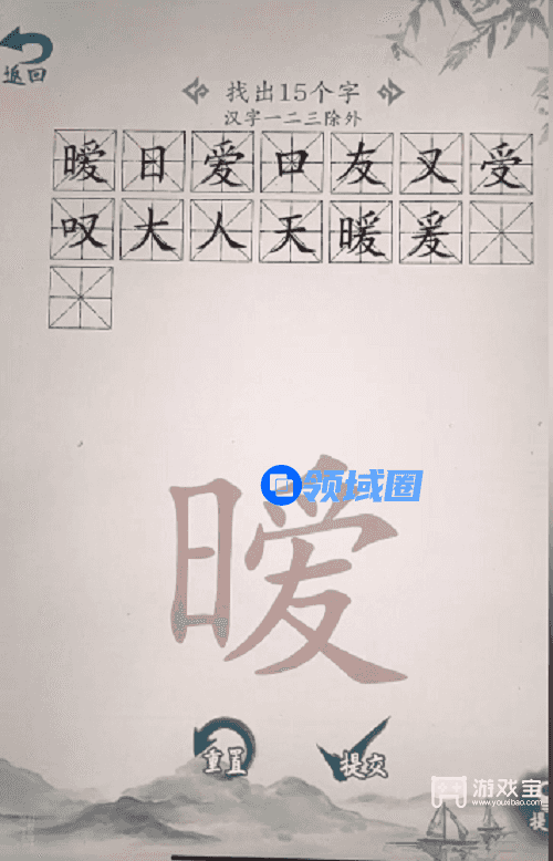 2、不知道这15个字是哪些的可以参考这个答案在暧字上面按照顺序写出来,写满15个字就可以过关了。
