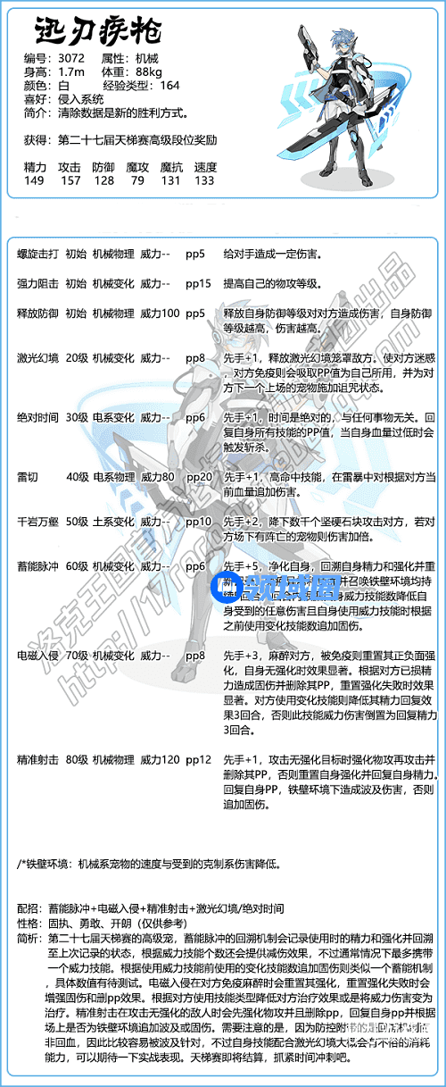 3、简析:第二十七届天梯赛的高级宠,蓄能脉冲的回溯机制会记录使用时的精力和强化并回溯至上次记录的状态,根据威力技能个数还会提供减伤效果。不过通常情况下最多携带一个威力技能。根据使用威力技能前使用的变化技能数追加固伤则类似一个蓄能机制,具体数值有待测试。电磁入侵在对方免疫麻醉时会重置其强化,重置强化失败时会增强固伤和册部pp效果。根据对方使用技能类型降低对方治疗效果或是将威力伤害变为治疗。精准射击在攻击无强化的敌人时会先强化物攻并且删除pp,回复自身pp并根据场上是否为铁壁环境追加波及或固伤。需要注意的是,因为防控附带的是回溯机制而非回血,因此比较容易被波及针对,不过自身技能配合激光幻境大概会有不俗的消耗能力,可以期待一下实战表现。