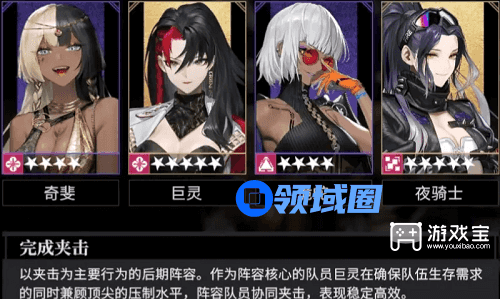4、以夹击为主要行为,辅以灼伤赋予的阵容。夹击连携行动的特点使其具有出色的压制力的同时,也可通过多次触发灼伤效果,使输出更进一步。