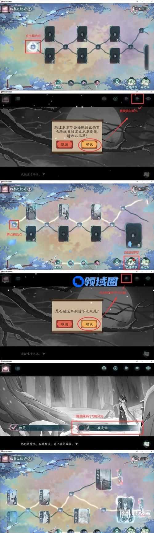 1、点击起始点→直接跳过章节→再点起始点→跳转至节点末尾→一路选择未打勾分支→全收集完成。