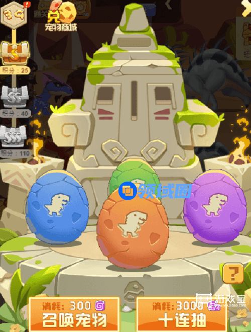 宠物召唤中有一个积分的系统,每抽一次可以累计1积分,当积分数达到110也就是抽了110抽的时候就能够直接随机兑换到一直SSS级宠物(剑齿虎,勐犸象,霸王龙三随一,当兑换一定次数后,就是能兑换SSS级万能碎片了),大家不用看110抽非常的多,要知道在游戏中符文获取的难度并不大。