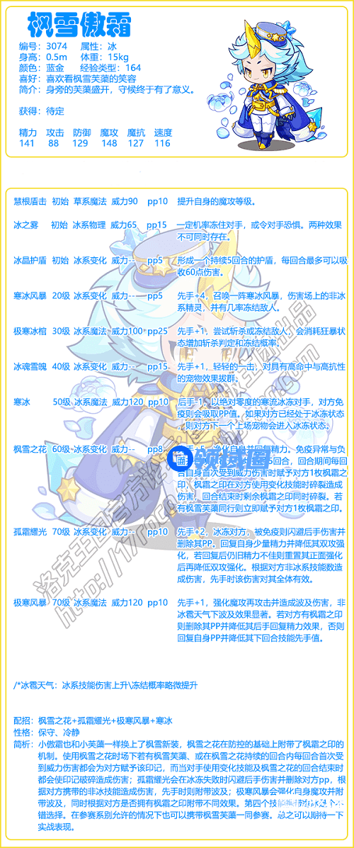 3、简析:小傲霜也和小芙藻一样换上了枫雪新装,枫雪之花在防控的基础上附带了枫霜之印的机制。使用枫雪之花时场下若有枫雪芙藻、或在枫雪之花持续的回合内每回合首次受到威力伤害都会为对方赋予该印记,而当对手使用变化技能及枫雪之花的回合结束时都会使印记破碎造成伤害;孤霜耀光会在冰冻失败时闪避后手伤害并删除对方pp,根据对方携带的非冰技能造成伤害,先手时则附带波及;极寒风暴会强化自身魔攻并附带波及,同时根据对方是否拥有枫霜之印附带不同效果。第四个技能携带寒冰是个不错选择。在参赛系别允许的情况下也可以携带枫雪芙藻一同参赛。总之可以期待一下实战表现。