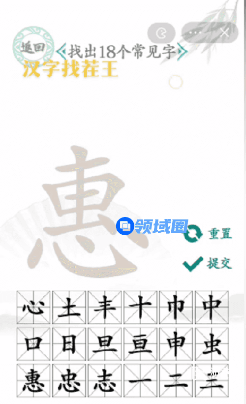 2、不知道这18个常见字是哪些的,可以看上图的文字在惠字上写出,就可以过关了。