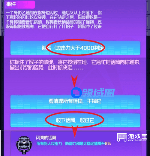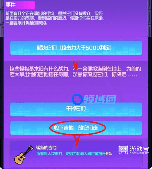 3、第三层问号房间找到图示事件按图里选择,拿到吉他即可后面正常通关就可以了。