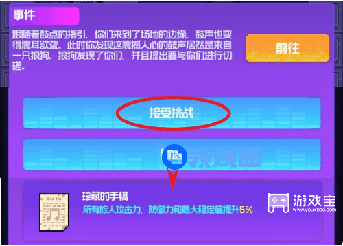 2、第二层问号房间找到图示事件接受挑战,拿到手稿即可。