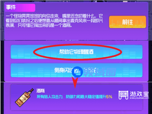 1、第一层问号房间找到图示事件帮它物理醒酒,拿到酒瓶即可。