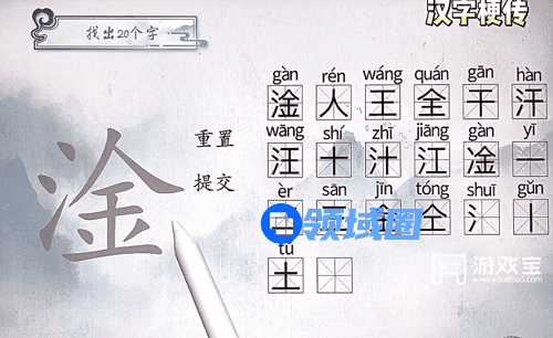2、不知道这20个字是那几个的,可以参考上面的20个字在凎字上面依次写出就可以过关了。
