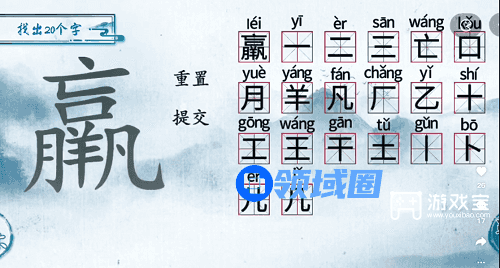 汉字梗传羸字关卡中,需要玩家从羸字上找出20个汉字才可以通过,哪这20个汉字是哪些呢?游戏宝小编带来汉字梗传羸找出20个字过关攻略,一起来看看吧。