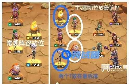 2、我们调整站位,将两个t分别放在两边,主c和奶妈放在前排(也可以把两个奶位放前面)。