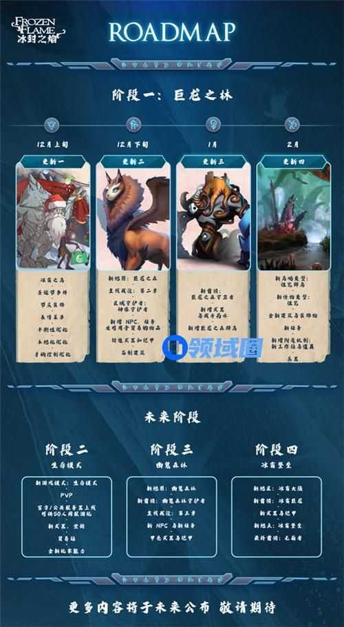 在接下来几个月《冰封之焰》将持续更新游戏内容,在第一阶段将会引入一个全新的区域巨龙之林,同时该区域还将引入更多的敌人供玩家挑战,以及一系列的NPC、任务及全新的武器装备等。DreamsideInteractive期望通过持续添加不同机制的游戏内容以确保玩家能够不断获得全新的游戏体验。