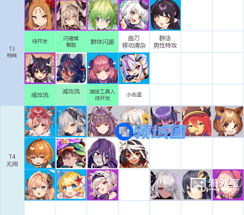 2、标记为浅绿色背景的角色代表其种族特性适合作为对策型角色,但是日常无大作用,强度可能较低。