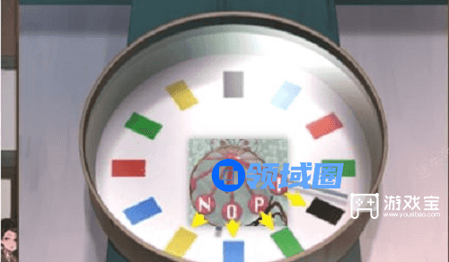 6、查看房梁上的钟表,对照坐垫上的图案,得到每个字母对应的颜色信息(N-黄色、O-蓝色、P-绿色、I-黑色)。