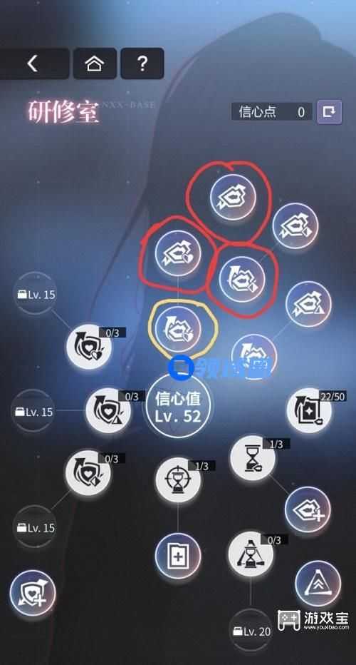 4、由于前三个是单色的,我们就可以根据这一点着重的去修改研修室,比如说游戏宝小编的蓝色卡非常的少,左上角我会以这样的方式来改,红色为点满,黄色为点一次,其他的属性依次类推,剩下的点数全点50级新开的。