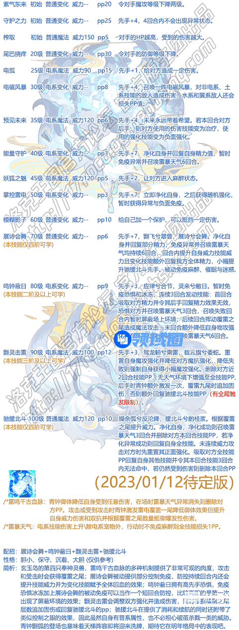 3、简析:玄玉岛的第四只奉神灵兽,雷鸣千古血脉的多种机制提供了非常可观的肉度,攻击和受击时会获得覆雷之尾;展诗会舞被动提供部分控制免疫,防控持续回合内还会提升技能威力并为变化技能赋予全体回血的效果;鸣钟蔽日拥有高先手恐惧,免疫恐惧冰冻加上展诗会舞的被动免疫可以当作一个短回合防控, 比较亮眼的是第-次出现了屏蔽环境的效果;翱灵击雷会调整双方强化并造成伤害,同时根据覆雷之尾层数追加固伤或回复驰援北斗的pp;驰援北斗在提供了消耗和续航的同时还附带了类似控制之眼的效果,因此虽然自身有普系属性,也不必担心破茧杀戮一类的威胁。青钟翻狐的登场也意味着天梯阵容即将迎来洗牌,期待它在明年格局中的表现吧。