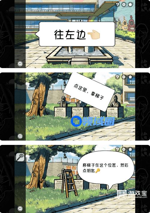 1、往左边滑,找梯子(梯子放了后,可以回收),拿树上的钥匙。