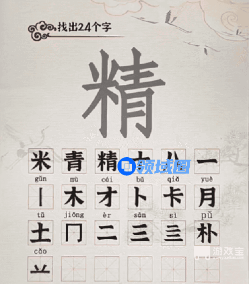 汉字派对找字关卡中,需要玩家从精上面找出24个汉字后才可以过关,很多玩家不知道这24个字是哪些,游戏宝小编带来汉字派对精找出24个字攻略,一起来看看吧。